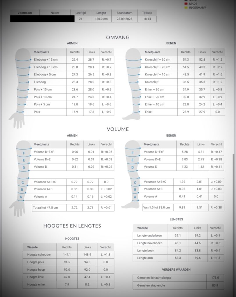 Met meer dan honderd meetpunten analyseert de scan je houding, spierbalans, asymmetrie en belasting — en geeft zo een uniek beeld van hoe jouw lichaam écht functioneert.