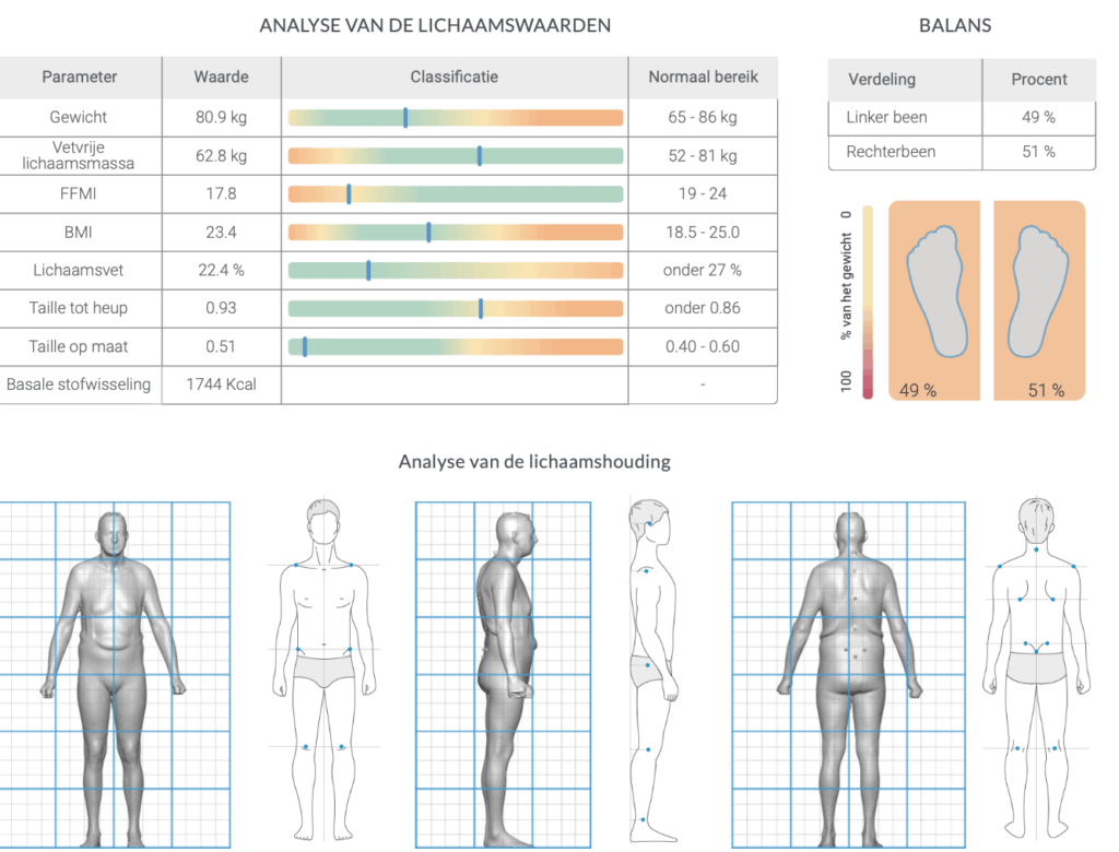 Met meer dan honderd meetpunten analyseert de scan je houding, spierbalans, asymmetrie en belasting — en geeft zo een uniek beeld van hoe jouw lichaam écht functioneert.