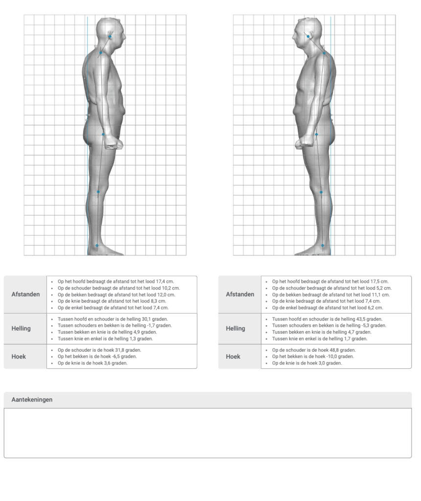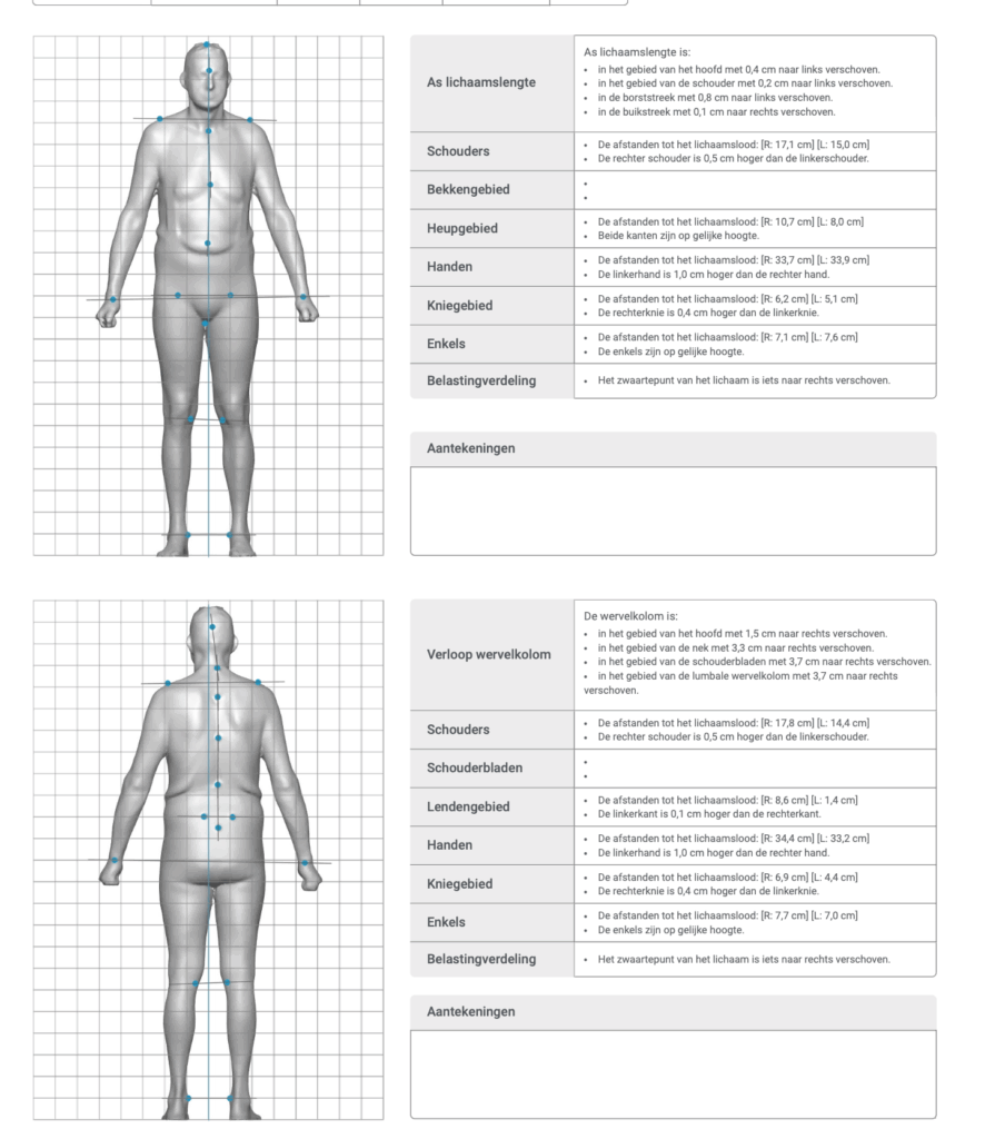 visuele 3D-weergave van je lichaam en een uitgebreid verslag in PDF met beenlengteverschillen, scheefstanden in bekken en wervelkolom en zoveel meer.
