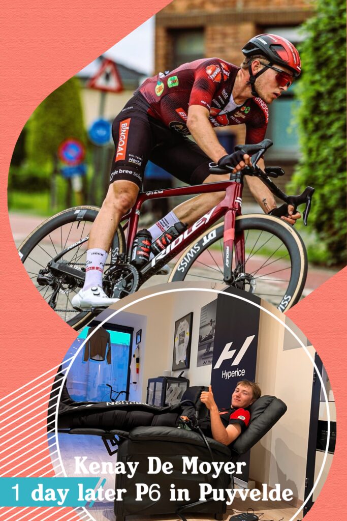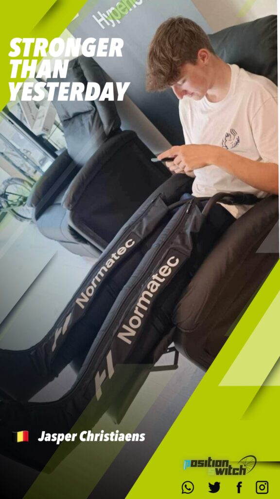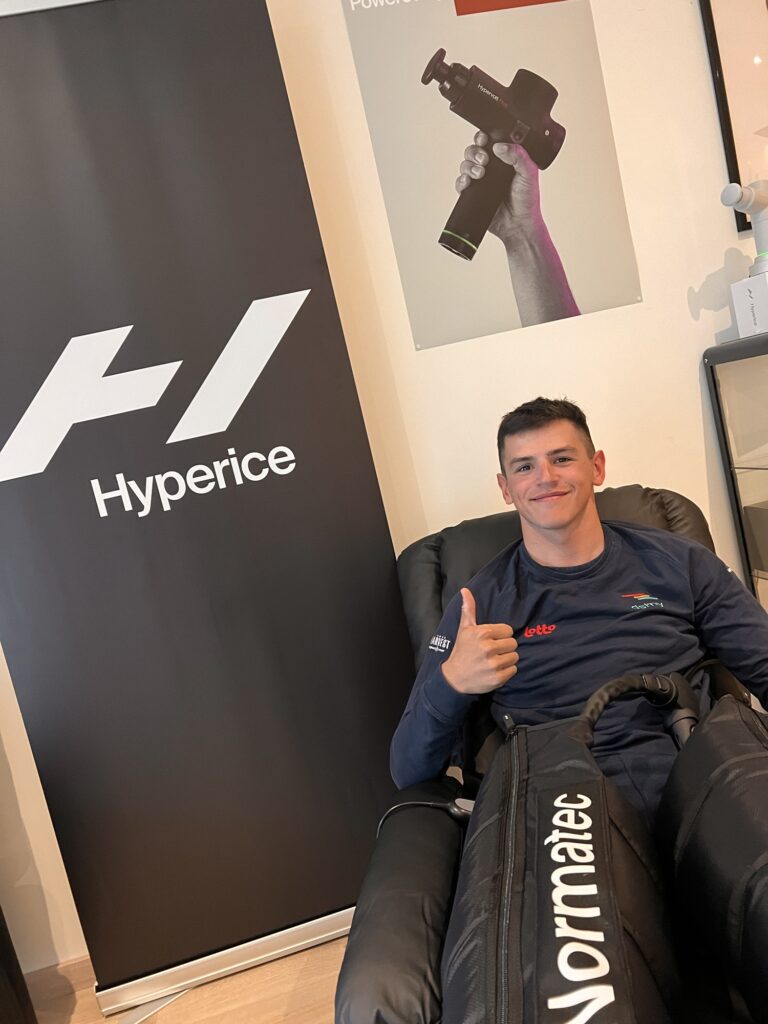 Hyperice massagegun in combinatie met warme massage en Normatec boots. Maakt spieren los en bereidt voor op prestatie.